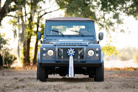 Project Blue Ribbon is an Equestrian Lifestyle Heritage Inspired Full Nut & Bolt Frame Off Bespoke Restoration of a Land Rover Defender by Ramble with an amazing combination of Porsche Graphite Blue paint paired with a Cognac Bentley Perforated Square Interior and Mohair Chocolate Soft Top riding on Black Lucrari XTR1 Alloy Rims